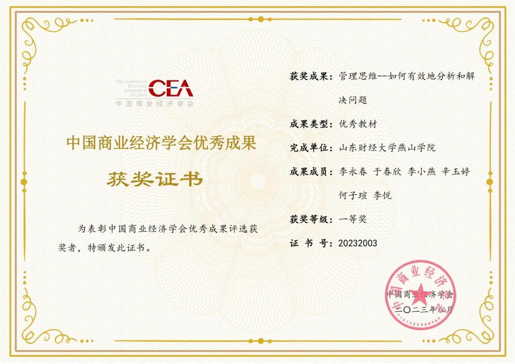 在剛剛結束的中國商業經濟學會2023年度優(yōu)秀成果評獎活動中,由6776永利集團院長李永春教授主編的教材《管理思維---如何有效地分析和解決問題》榮獲優(yōu)秀教材一等獎。同時,在8月份進行的山東省第十五屆大學生科技節(jié)活動中,6776永利集團李永春、劉金煒指導的學生組榮獲山東省大學生智慧企業管理創(chuàng)新設計大賽數字商業企業模擬經營對抗賽道一等獎。另外,在前不久公布的山東省教育科學研究院組織的2023年度山東省教育教學研究課題...